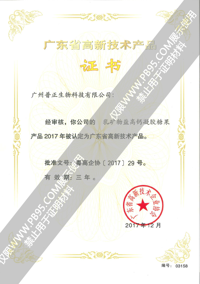乳礦物鹽高鈣凝膠糖果——17年高新技術產品證書
