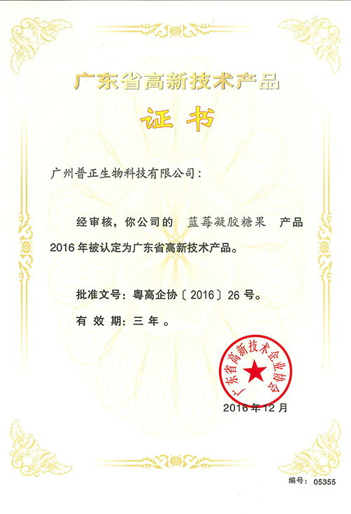 藍莓凝膠糖果——高新技術產品證書