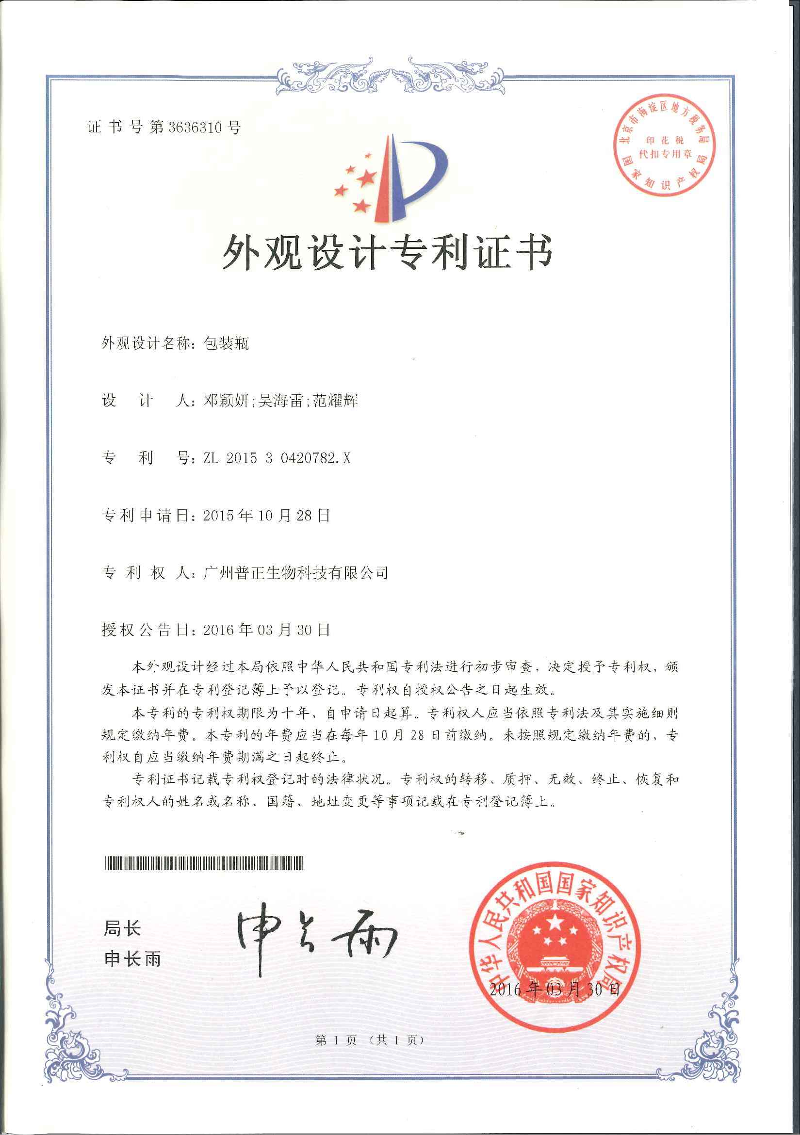 普正包裝專利證書(專利號:ZL201530420782.X)