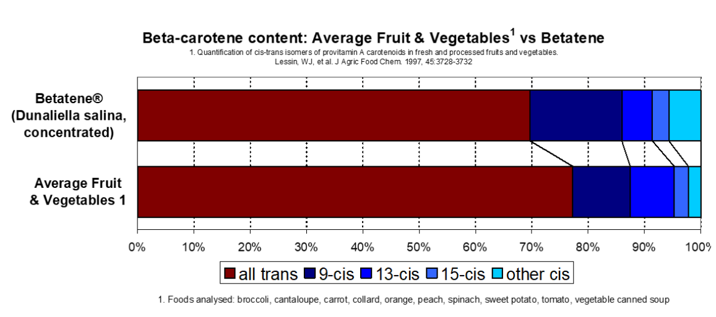 杜氏鹽藻提取物中的類胡蘿卜素混合物和β-胡蘿卜素異構體比例為63:37,β-胡蘿卜素異構體組成與果蔬中比例相似,并特別富含9-順式異構體。