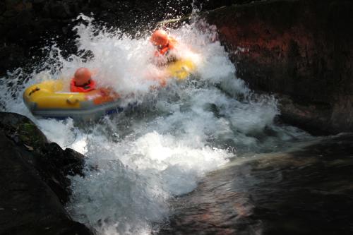 接下來(lái)是驚險(xiǎn)刺激的漂流了!被譽(yù)為“浪尖上的過(guò)山車”的古龍峽漂流,有著全國(guó)最大的漂流落差、最刺激的漂流體驗(yàn)。參加了漂流活動(dòng)的帥哥美女們游玩云天玻霸后,迫不及待地下山,一到漂流地點(diǎn),就歡呼雀躍地穿上救生衣和頭盔,縱身跳上橡皮艇,隨著清流激湍一路漂游而下,體驗(yàn)一把過(guò)山車般的刺激快感!
