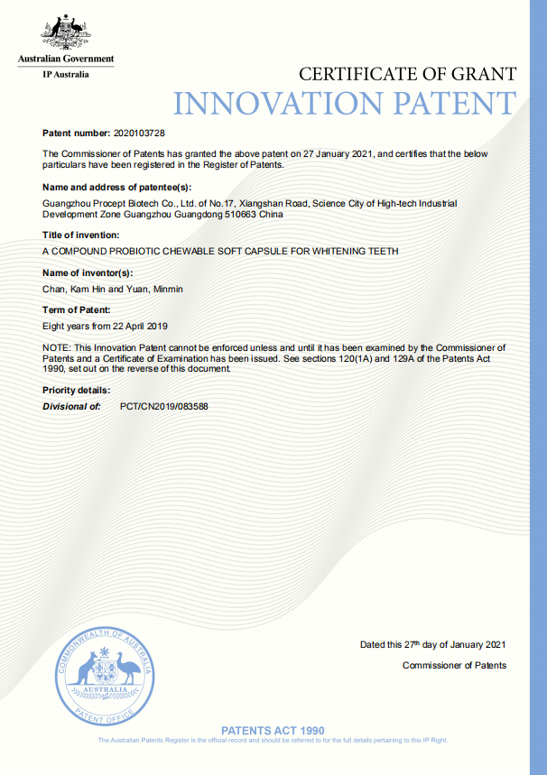 普正生物作為一家長期致力于研發的技術型公司,普正生物自2005年創立以來收獲了一眾專利與榮譽,最近又喜獲了一項新的國際發明專利——口腔益生菌專利證書--澳大利亞