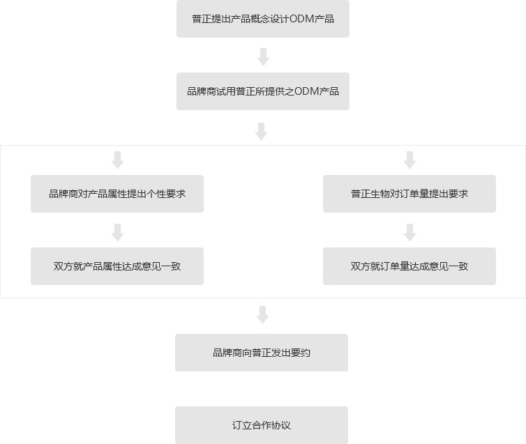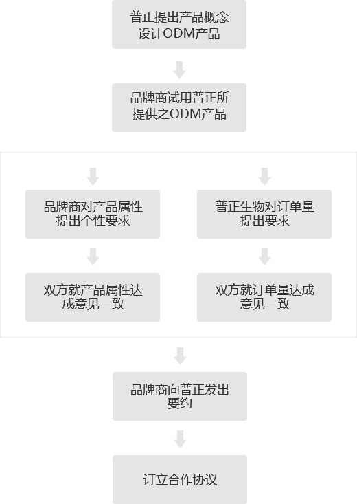 色、香、味、效 個性化定制! ODM 是指制造商設計出某產品后,在某些情況下可能會被另外一些企業看中,要求配上后者的品牌名稱來進行生產,或者稍微修改一下設計來生產。這樣可以使經銷商或其他廠減少自己研制的時間。承接設計制造業務的制造商被稱為 ODM 廠商,其生產出來的產品就是 ODM 產品。 普正生物科技 ODM 定制化業務流程如下: